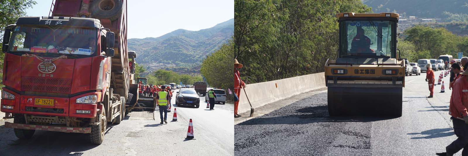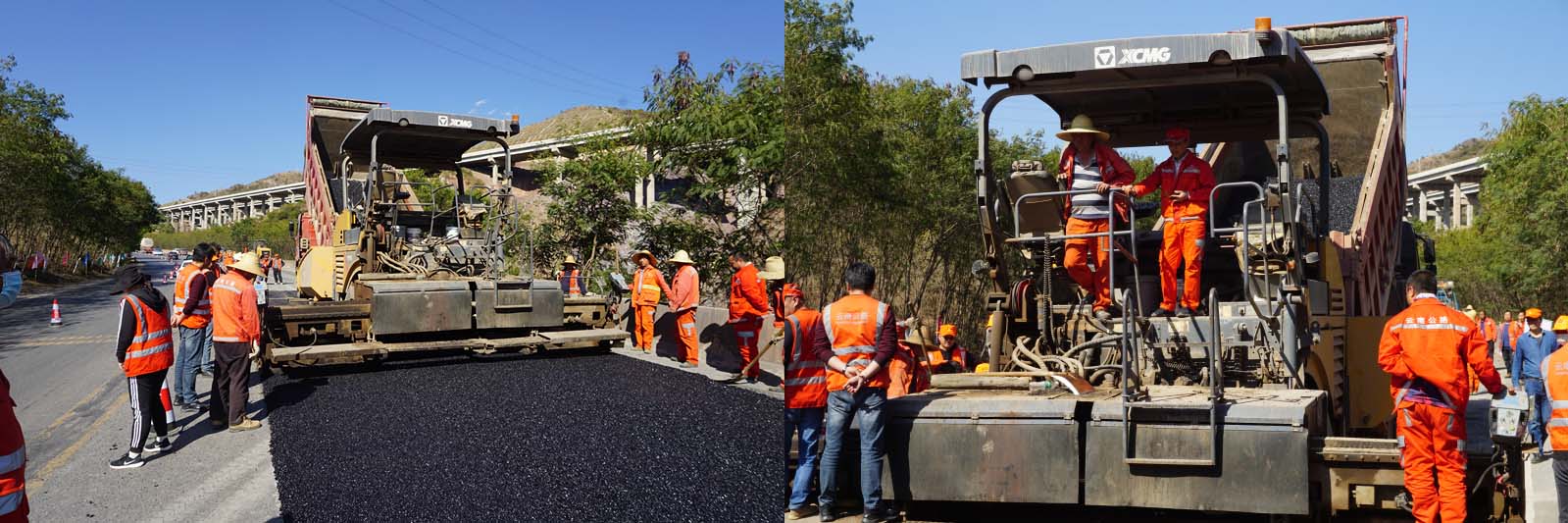 在現場觀摩環節,參會領導及相關負責人集中前往玉楚高速浪皮樹1、2號大橋路段,進行了現場施工的攪拌、攤鋪、壓實的觀摩。同時,云南路陸邦、西安永和科技對BMH冷拌冷鋪技術試驗段情況進行了介紹,包括試驗路段的冷拌冷鋪優勢、應用場景、施工工藝、施工標準等,參會領導紛紛對云南路陸邦、西安永和科技的工作及成效給予了高度評價,對冷拌冷鋪技術進行高度肯定。